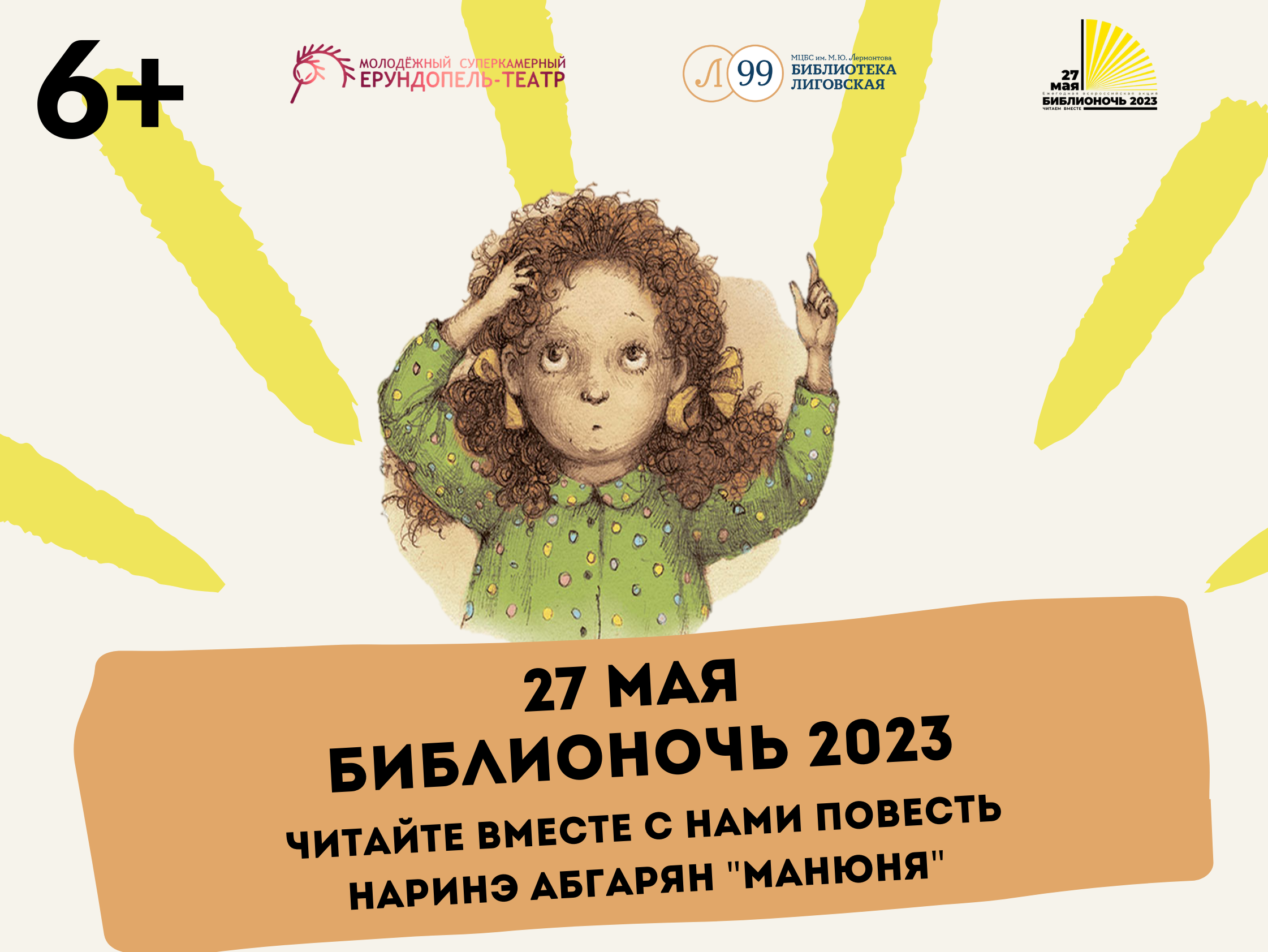 27 мая с 18:00 до 22:00 в рамках акции «Библионочь-2023» библиотека «Лиговская» предлагает гостям прочитать вместе повесть Наринэ Абгарян «Манюня». Вместе с главной героиней и ее друзьями вы погрузитесь в атмосферу беззаботного лета 80-х.